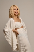 В комплект входить шнурівка з атласної тканини у вигляді троянди та розкішний топ .Довжина жакету від коміра по спинці - 78 см .Довжина рукава від плеча до низу - 72 см. Штани-палацо виконані також з плісе . застібка блискавка з лівого боку . Довжина від талії до низу - 110 см.