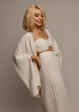 Жакет виконаний з плісе без підкладу. На рукавчиках симетричний розріз . Застібка , однобортна ,на один потайний ґудзик .