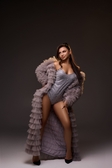 У комплект входить неймовірна об’ємна накидка максі-довжини з довгими рукавами — додає образу розкіш та театральність.